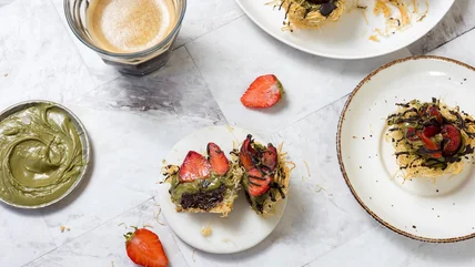 This dessert takes the kataifi pastry that comes chopped inside the traditional Dubai chocolate bar and turns it into petite baked containers, almost like noodle nests. We pipe these cups with a touch of melted dark chocolate and pistachio cream, and then crown the whole thing with strawberries. The result is a melange of textures, colors, and flavors that pays homage to the original Dubai chocolate bar while being inventive all on its own.