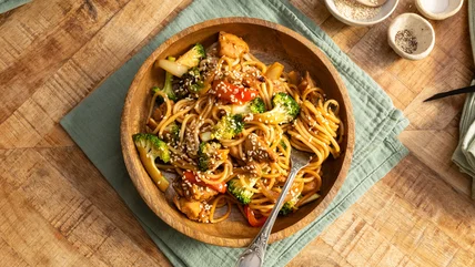 With tender, umami-rich marinated chicken, bright fresh vegetables, and a spicy chili-crisp infused sauce, this satisfying noodle dish brings a kick of heat.